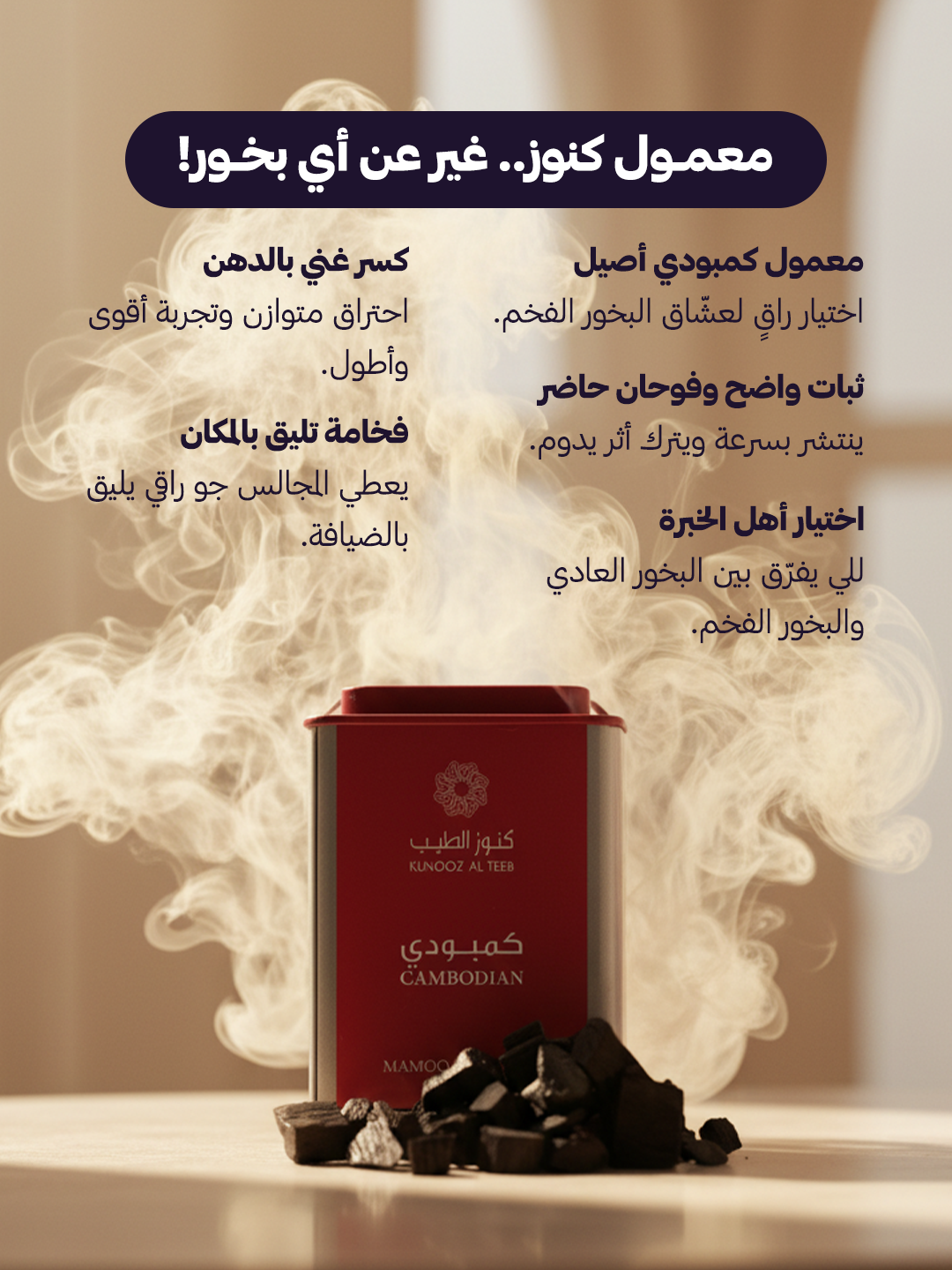 معمول كمبودي هو خيار مثالي لعشّاق البخور الفاخر الذين يبحثون عن الجودة، الثبات، والرائحة المميزة. تم اختياره بعناية ليقدّم تجربة عطرية متوازنة تجمع بين الفوحان الواضح والحضور الراقي.